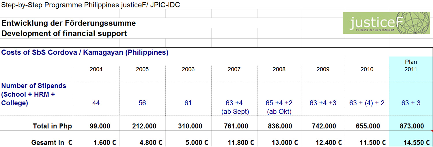 Zurzeit fließen jährlich rund 13.000 Euro an Stiftungsmitteln in das Programm. Hier finden Sie den Umfang der Förderaktivitäten der Stiftung in Sitio Camolinas und Kamagayan für die Jahre 2004 bis 2011 auf einen Blick: